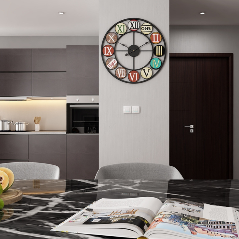 With its retro yet fashionable iron design, this wall clock complements a variety of architectural styles. It is perfect for enhancing the decor of your home, loft, café, bar, hotel, garden, bedroom, or living room. This unique piece of art will make a stunning addition to any room.